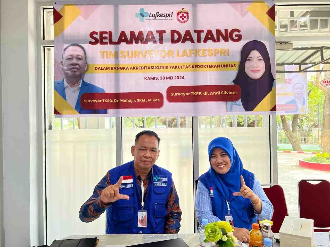 Surveyor tersebut dalam rangka Akreditasi Klinik Fakultas Kedokteran Unhas. Tim Surveyor Lafkespri diantaranya Surveyor TKSD Dr Muhajir SKM MKes dan Surveyor TKPP dr Andi Silviani.