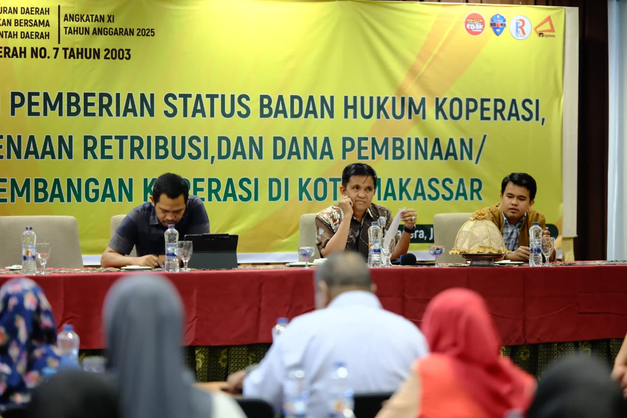 Narasumber pertama, Arlin Ariesta, memaparkan secara lengkap proses dan persyaratan pemberian status badan hukum koperasi sesuai amanat perda. Ia menjelaskan bahwa prinsip utama dalam pembentukan koperasi adalah kejelasan struktur organisasi, komitmen anggota, dan transparansi pengelolaan. Arlin menjelaskan bahwa Dinas Koperasi Kota Makassar terus mendorong agar koperasi memiliki manajemen yang lebih modern melalui digitalisasi layanan, pelatihan manajemen keuangan, serta peningkatan kompetensi sumber daya manusia. Menurutnya, salah satu tantangan utama adalah masih rendahnya literasi kelembagaan di kalangan masyarakat, sehingga banyak yang membentuk koperasi tanpa memahami regulasi dasar. Dengan penerapan perda ini, setiap koperasi wajib memiliki dokumen yang sah dan memenuhi persyaratan administratif sebelum beroperasi. Arlin juga menyinggung mengenai mekanisme pengenaan retribusi dan pemanfaatannya, di mana dana tersebut dikembalikan untuk memperkuat program pembinaan dan pengembangan koperasi.