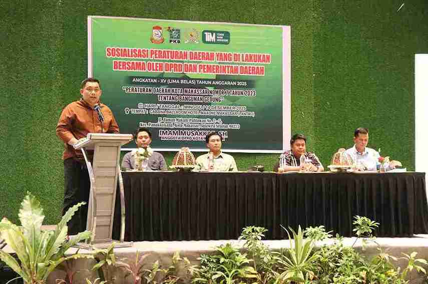 RUMAHRAKYAT.NEWS_ Makassar – Anggota DPRD Kota Makassar, Imam Musakkar, SH, melaksanakan kegiatan Sosialisasi Peraturan Daerah (Perda) yang merupakan kerja sama antara DPRD Kota Makassar dan Pemerintah Daerah Tahun Anggaran 2025. Kegiatan Angkatan XV ini mengusung tema Peraturan Daerah Kota Makassar Nomor 7 Tahun 2023 tentang Bangunan Gedung, yang dilaksanakan pada Minggu, 14 Desember 2025, bertempat di Hotel MaxOne Makassar. Sosialisasi ini dihadiri oleh tokoh masyarakat, perwakilan instansi teknis, serta berbagai unsur masyarakat yang memiliki kepedulian terhadap tata kelola pembangunan dan penataan ruang di Kota Makassar. Kegiatan tersebut menjadi bagian dari upaya DPRD dalam menjalankan fungsi legislasi dan pengawasan, sekaligus memastikan bahwa regulasi daerah yang telah ditetapkan dapat dipahami dan dilaksanakan secara optimal oleh masyarakat luas.